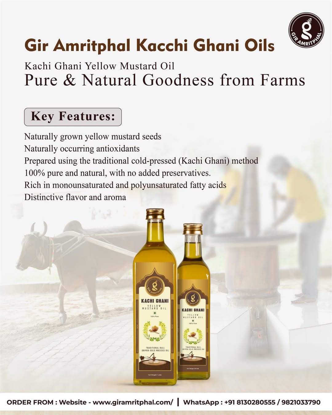 Discover the bold and invigorating taste of our Kachi Ghani Black Mustard Oil. Sourced from the finest naturally grown black mustard seeds cultivated on our own fertile lands, this oil is cold-pressed (Kachi Ghani) using traditional techniques to preserve its potent flavor profile and inherent nutritional value.